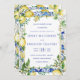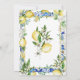 Yellow lemons and white flowers decorate Italian blue mosaic tiles to create an elegant citrus wedding invitation.