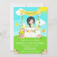 This cute and whimsical invitation features a black hair girl with fair skin at a lemonade stand which is decorated with flowers and bunting. In the background is a blue sky, sunshine and butterflies. The text combines decorative and sans serif fonts for a stylish and modern look. This is perfect for a summer birthday party.