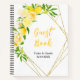 This beautiful and elegant wedding guest book features watercolor citrus lemons and foliage on a gold geometric frame. The text combines handwritten script and serif fonts for a stylish and modern look. This is perfect for a spring or summer rustic wedding.