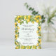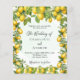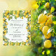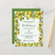 A green watercolored background. Decorated with yellow lemons and green foliage. Personalize and add your names and details. The name is written with a hand lettered style script.
