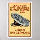 This vintage World War One poster features a giant coin crushing a German soldier. It reads, "Lend Your Five Shillings To Your Country And Crush The Germans". Celebrate WW1 and British History with this digitally restored vintage poster from The War Is Hell Store.
