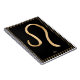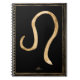 Stylized hammered gold Leo the Lion astrology zodiac birthday symbol in a hand drawn gold double line frame. This notebook or dream journal or writing pad has Leo text in a fine script, which can be personalized to narrate your own story.