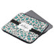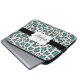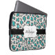 Leopard print design neoprene laptop sleeve in aqua, grey, and white with a black stripe, white edged with black banner you can personalize with your name and monogram initial!