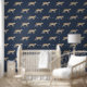 LARGE SCALE 12 inch pattern repeat. Rich navy blue grasscloth like texture with a vintage modern walking leopard, nature botanical illustration in neutral natural colours. Classic English or French masculine elegance for bedroom, office or library. Available in multiple scales for large and small spaces. Art by internationally licensed artist and designer, Audrey Jeanne Roberts ©. Audrey Jeanne's artwork is available for licensing through MHS Licensing.