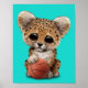 This adorable design features a small leopard cub with its paw on a basketball. The cat is looking forward with its head tilted slightly giving it a cute and curious look. This sporty leopard design is perfect for all basketball fans.