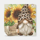 Adorable little gnome in a leopard print has gathered some sunflowers.