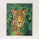 Puzzle in a leopard with bright, intense eyes peering through lush green foliage. The sharp contrast between the leopard's spotted fur and the vibrant leaves creates a striking visual effect.