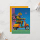 A vibrant, surreal artwork featuring a leopard riding a bright orange scooter against a vivid blue sky. With pink roses in the background and a stylish purple scarf, this scene merges wildlife and urban coolness, creating a whimsical, eye-catching visual.