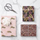 Pink and gold leopard jungle theme wrapping paper. Featuring leopards on pale pink, leaves on black and pink and gold leopard print.