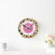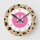 A clock featuring an illustration of a pink circle at centre. Background is leopard print pattern. Numerals are pink and black. Personalize with your name and initial.
