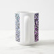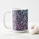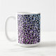 This ceramic coffee mug is shown with a blue multi colour leopard print.