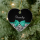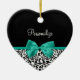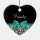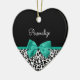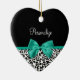 Personalize by adding the name of any girly girl to this trendy black and white leopard print heart-shaped ornament with a girly emerald green ribbon tied into a cute bow. This stylish animal print design is a flat printed image, and does not contain actual ribbon.