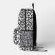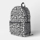 Backpack in a leopard animal print in in black spots accented with grey on a white background