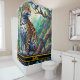 A striking Shower Curtain features a majestic leopard lounging on a vibrant, twisting branch, surrounded by colourful tropical birds and lush foliage, embodying a lively jungle atmosphere.