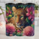 This vibrant illustration features a majestic leopard with striking green eyes, partially hidden amongst lush tropical flowers and foliage. The flowers are in shades of pink and red, with large, detailed petals and green leaves. The leopard's spotted fur blends subtly with the rich colours of the surrounding flora, creating an intimate and exotic wildlife portrait.