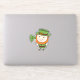 Comical cartoon leprechaun wearing a green hat and suit, has a ginger beard and is holding a lucky shamrock.