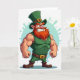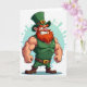 This card features a muscular leprechaun centered on the front, standing squarely with clenched fists as if he’s ready to show off for a friend 💚. He wears an emerald-green sleeveless top and a matching top hat, with broad shoulders and defined arms filling most of the frame. A flame-red beard and thick eyebrows surround a wide grin that feels like a teasing dare, the kind you’d share with someone you’re close to ☘️. His bright green eyes are open wide and focused forward, giving him an intense, mischievous look. The background stays mostly white, keeping attention on the character while adding a soft, abstract light-blue splash behind him. Any text sits up near the top in green, leaving the leprechaun’s chest and arms unobstructed in the middle. The red beard and green outfit pop against the pale backdrop, while the blue splash sits slightly off-center behind his shoulders. A friendly line about sharing St. Patrick's Day sentiments.