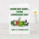 This card shows a cheerful cartoon leprechaun lounging on a white background, head tipped back as if laughing, with one arm lifted like he’s waving to a close friend 💚. He wears a tall green hat with a buckle, a buttoned green coat, and bright green trousers, and his fiery orange beard frames a wide grin and rosy cheeks. The relaxed pose and open smile make the scene feel like an inside joke shared between pals or sweethearts. Near the top, the main message appears in green uppercase letters: “YOU’RE NOT SHORT… YOU’RE LEPRECHAUN SIZE!”, spaced across the white space so it reads clearly above him ☘️. Lower on the design, “HAPPY ST. PATRICK’S DAY!” sits as a festive line in matching green, anchoring the layout. The greens range from deeper forest tones to lighter lime accents, keeping the outfit lively against the plain backdrop. The illustration uses simple shapes and flat color, with the leprechaun’s buckled hat and curled beard standing out as the key details. The final touch is the crisp white field surrounding him, giving plenty of breathing room around the green text and his raised arm.