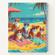 Journal dans cinq chats élégants se détendre sur une plage ensoleillée, allongé sur des serviettes rayées sous les palmiers. Ils portent des lunettes de soleil colorées et des casquettes en paille, profitant d'un séjour tropical, avec une mer turquoise et un ciel bleu vif derrière eux.