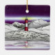 A landscape illustration of Les Eclaireurs Lighthouse in Argentina. This design has a purple night sky and mountain range reflecting in the calm ocean.