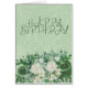 Célébrez votre journée spéciale avec la beauté paisible de la verdure et des fleurs. Cette carte d'anniversaire de The Botanical Press présente un arrière - plan vert sauge doux avec des motifs botaniques subtils, accentué par un arrangement d'aquarelle luxuriante d'eucalyptus, de roses blanches et de fleurs délicates. Le message "Happy Birthday", écrit à la main, ajoute une atmosphère gracieuse et organique, parfaite pour les amoureux de la nature et les amoureux de la nature plante.