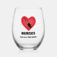 Ce design en verre de vin sans tache a un coeur rouge avec une photo et un texte qui dit "INFIRMIÈRES APPELENT TOUTES LES TIRS". Au fond du verre, vous pouvez ajouter un nom.