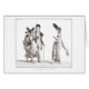 Two "Mérveilleuses," accompanied by an "Incroyable" take a stroll on a Paris street. They wear the exaggerated hats and hairstyles of the period. At the end of the French Revolution, a wave of relief and of fashion giddiness swept Paris. Young men known as "Incroyables" and their female counterparts "Les Mérveilleuses" rejoiced in adopting a wildly exaggerated look which flouted the social conventions of the time. This card is reproduced from the original in our own collection.