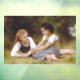 The warm autumn sun dappled through the leaves of the hazelnut tree, casting dancing shadows on the forest floor. Two young girls, Elise and Juliette, sat beneath its branches, a small pile of golden nuts nestled amongst the fallen leaves. - Elise, the elder of the two, leaned against the rough bark of the tree, a mischievous glint in her eyes. She held a handful of nuts teasingly above Juliette's head. "Try to catch them, petite souris!" she chirped, scattering the nuts with a delighted giggle. - Juliette, a whirlwind of motion, chased after the falling nuts, her laughter echoing through the woods. She scooped up a handful, her face flushed with exertion and delight. "You're impossible, Elise!" she exclaimed, her voice breathless. - Elise grinned, her eyes crinkling at the corners. "That's the idea, ma petite!" she retorted, tossing a few more nuts into the air. - They tumbled and rolled amongst the leaves, their laughter mingling with the gentle rustling of the trees. For a moment, the world seemed to shrink to just the two of them, lost in their own private game. - Juliette, catching her breath, looked around at the dappled sunlight filtering through the leaves. "It's so beautiful here," she sighed contentedly. "I wish we could stay here forever." - Elise nodded, gazing up at the canopy of leaves. "Me too," she admitted. "It's like a secret garden." - They fell silent, content in the companionship of each other and the peaceful tranquillity of the woods. Elise, ever the dreamer, began to imagine what they would do with their treasures. "Perhaps we could roast them over the fire," she mused, "and tell stories all evening." - Juliette's eyes widened. "Or maybe we could make a necklace for Grand-mère," she suggested, her voice filled with excitement. "She loves hazelnut necklaces." - As the sun began to dip below the horizon, casting long shadows across the forest floor, the girls reluctantly gathered their nuts and began to make their way home. They walked hand-in-hand, their laughter fading into the distance, leaving behind a trail of golden leaves and the lingering scent of autumn. - The woods, once alive with their playful chatter, returned to its peaceful slumber, the only sound the gentle whisper of the wind through the trees. But the memory of their laughter, like the scent of woodsmoke, lingered long after they were gone, a reminder of the simple joys of childhood and the enduring magic of a shared secret. - Les Noisettes or The Nut Gatherers is an 1882 oil painting by the French artist William-Adolphe Bouguereau. This work is in the public domain in its country of origin and other countries and areas where the copyright term is the author's life plus 100 years or fewer.