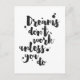 Carte postale inspirante affichant l'expression "Dreams ne fonctionne pas à moins que vous ne le faites" dans un script de brosse noire avec une texture d'encre organique pour obtenir un look authentique, lettré à la main.