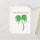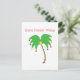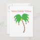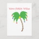 Une carte postale tropicale pour la saison des vacances d'hiver. La couverture indique, "des vacances chaudes souhaite" au-dessus d'un palmier décoré et de fête.