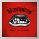 Poster de vampire avec le texte amusant Vampires Don't Do Dures et une oeuvre originale d'une bouche de vampire avec des crocs et des dents cassées, des créatures maléfiques se cachant derrière dans l'arrière - plan texturé gris foncé et rouge. Grand design pour Halloween et pour les amateurs de style gothique avec un sens de l'humour.