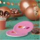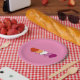 Paper plates with hearts in colours of lesbian pride flag, pride design on a pink background; orange, white, and pink hearts
