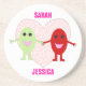 This pretty sandstone coaster features a cute cartoon of a smiling red grape holding hands with a smiling green grape, both grapes have shiny black eyes and pink mouths. The grapes are standing in front of a pretty pink heart and there is customizable pink text above and below the heart so you can personalize it with the name of a lesbian couple. This would make a great valentines day gift.