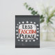 "Less Fascism Please" is a cute text design in grey with black and red text, along with a white accent shape and white textured whimsical dots surrounding it.