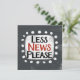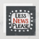 "Less News Please" is a cute text design in grey with black and red text, along with a white accent shape and white textured whimsical dots surrounding it.