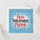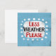 "Less Weather Please" is a cute text design in blue with black and red text, along with a white accent shape and white textured whimsical dots surrounding it.