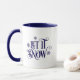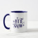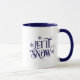This ceramic coffee mug is shown in a festive holiday print let it snow.