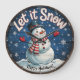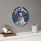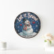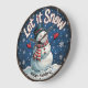 This charming clock features a cheerful, cartoon-style snowman wearing a top hat and a red-and-white striped scarf and mittens, set against a dark blue wood-plank background and falling snow. The bold white text "Let it Snow" dominates the top, with "Happy Holidays!" scripted below. The design may look real due to the high detail and three-dimensional texture in the artwork.