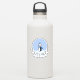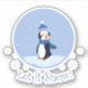 A penguin wearing a blue hat and scarf stands in the snow and watches the snowflakes fall.