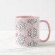 This is a pretty winter holiday mug with a light pink background, white snowflake shapes and the words Let It Snow in gold script in the centre. The snowflake design was created with generative art. The art features the words Let It Snow in gold script and white snowflake shapes on a light pink background. The mug is a combo mug with a pink interior and a pink handle. The mug is an eleven ounce coffee mug.