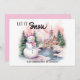 Cute pink snowman with a backdrop of snow-covered mountains and an old church Christmas/holiday greeting card. Custom text says, "Let it snow." Personalize with your family name and any other text you choose.