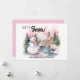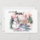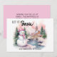 Cute pink snowman with a backdrop of snow-covered mountains and an old church Christmas/holiday greeting card. Custom text says, "Let it snow." Personalize with your family name and any other text you choose.