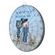 Let It Snow Snowman Dart Board features a snow scene background with falling snow, snow covered pine trees, a child on a stool putting the finishing touches on his snowman. The child is dressed in blue and the snowman has a blue scarf and black top hat. There is a reindeer looking on by the pine trees. Snow covered blue text is Let It Snow! Perfect for Christmas Party games or as a Christmas gift! Includes 6 brass darts (3 American flag dart flights and 3 UK dart flights). Regulation size board (18” diameter, 1” thick). Finished with aluminum frame and hanging hook.