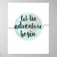 "Let the Adventure Begin." Inspirational words to live by, this message reminds us to look forward to what is ahead and not dwell on the past. Hand lettered calligraphy looking text in a classic black on against a stylized world on a white background works with any decor, dorm room or child's room.