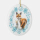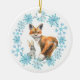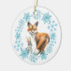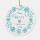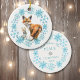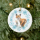 This heart warming Christmas ornament has a pretty blue snowflake wreath which frames watercolor images of a red fox and little bunny. The back of the ornament has the same blue wreath with the text in matching blue "Let there be PEACE". Two more text fields are for your customization, with a silver snowflake serving at the middle as a divider.
