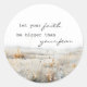 Christian round sticker depicts a beautiful nature watercolor scene in light earth tones with a field of grass and wildflowers in light tan earth tones. It features an encouraging inspirational quote, "Let your faith be bigger than your fear."