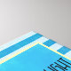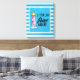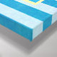 A canvas print with a blue striped pattern. A blue frame with a yellow border layered over top with a digital watercolor image of a red striped lighthouse inside.