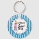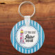 A keychain with a blue striped pattern. A circle with a nautical theme layered over top with a watercolor image of a red striped lighthouse inside. Typography text reads: Let your light shine bright.