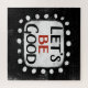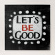 "Let's Be Good" is a cute text design in black with black and red text, along with a white accent shape and white textured whimsical dots surrounding it.
