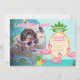 Celebrate a tropical birthday with this adorable paradise birthday invitation! Features cute pink flamingos, yellow pineapple, a turquoise/blue chevron frame on top of a photo background for your to fill with any photo of your choice.